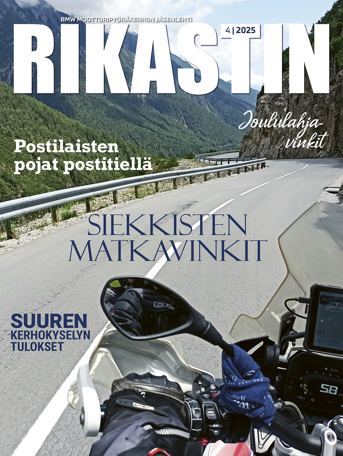 | RIKASTIN 4/25 ON JULKAISTU! Tässä numerossa tutustutaan Siekkisten matkavinkkeihin ja jo totuttuun tapaan katsellaan joululahjaideoita! Lisäksi muiden mielenkiintoisten artikkeleiden ohessa pureudumme suuren kerhokyselyn kakkososaan eli meitä jäseniä koskeviin tuloksiin. Muistuttaisimme, että juttuvinkkejä, -toiveita ja valmiita juttuja seuraaviin lehtiin voi edelleen lähettää osoitteella rikastin(a)bmwmoottoripyorakerho.fi. Rohkeasti vain tekstejä lähettämään! |